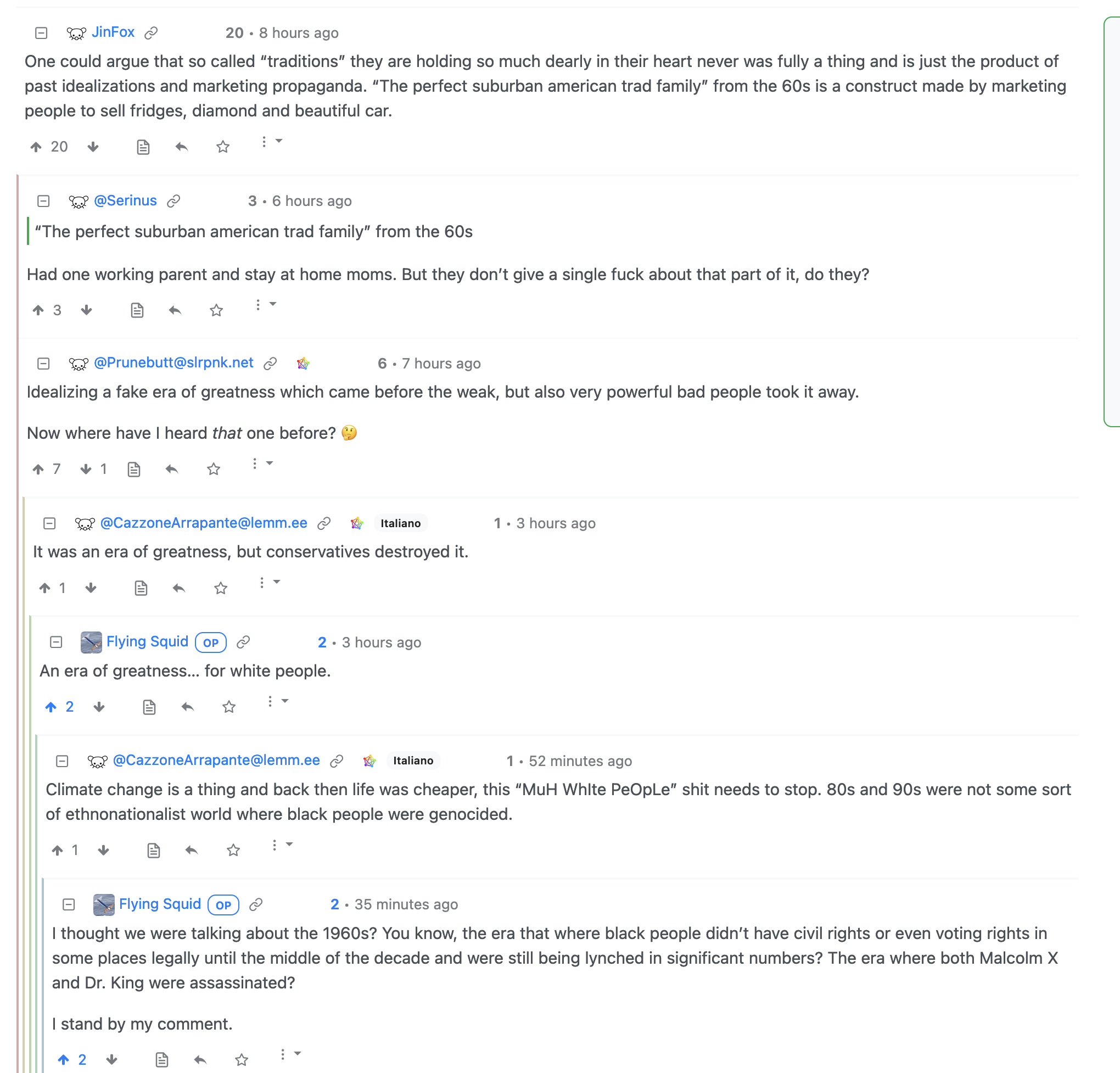 Maybe you people need to realize that many people don’t miss people black people being hanged, but being able to run a house with one salary, not having crazy seasons, the Earth not hitting warmth records every year, a not corporatized world and not having youth with their brains fried by Tiktok.