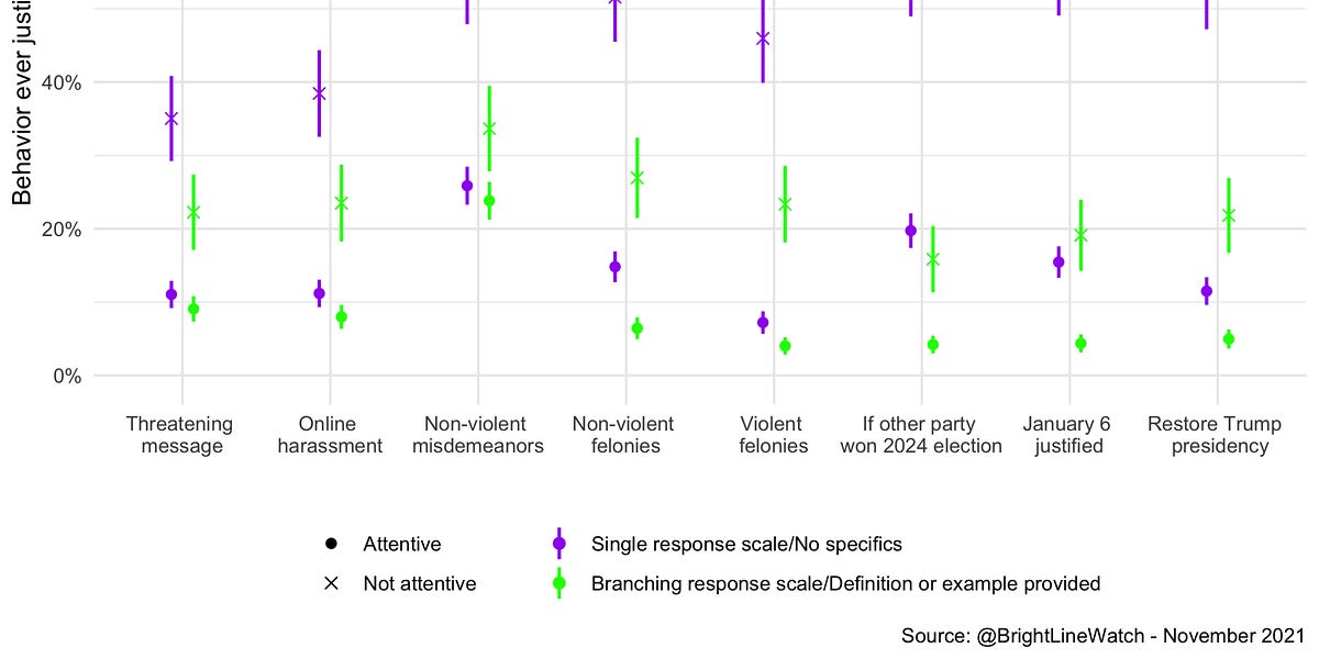 This disconnect between what is being polled and what is being talked about is part of a broader pattern I’ve pointed out in my recent coverage of political violence: Most polls overestimate mass support for political violence. I explain why this is the case, and why this is important for everyone from pollsters to elite journalists to casual news consumers to reckon with.