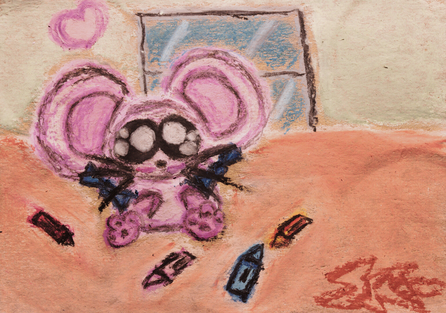 An oil pastel drawing of Bijou chilling on a desk, surrounded by crayons.