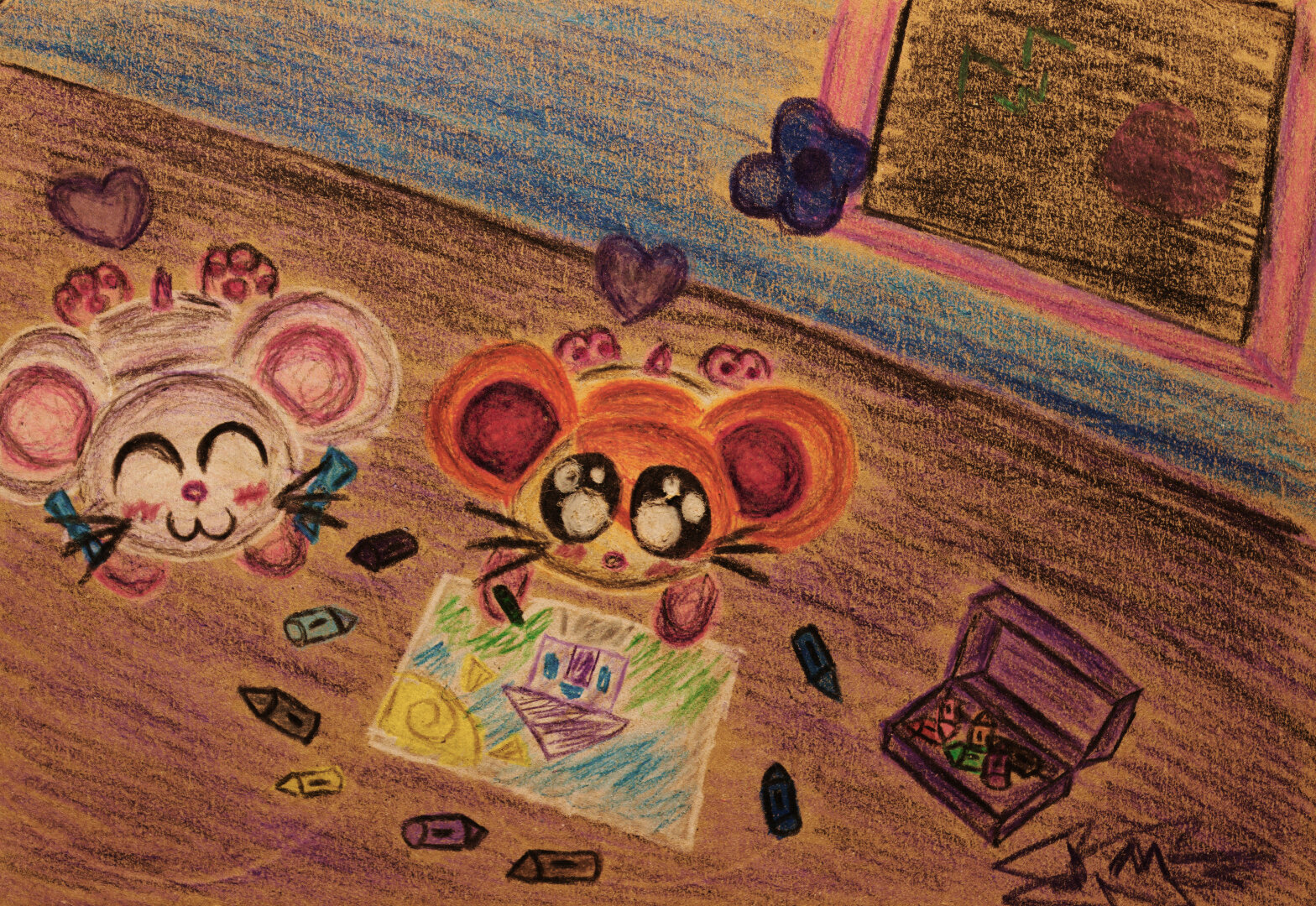 A colored pencil drawing of Hamtaro doodling in a playroom while Bijou just vibes next to him. There’s a blackboard with a heart and emote doodle on it in the background.
